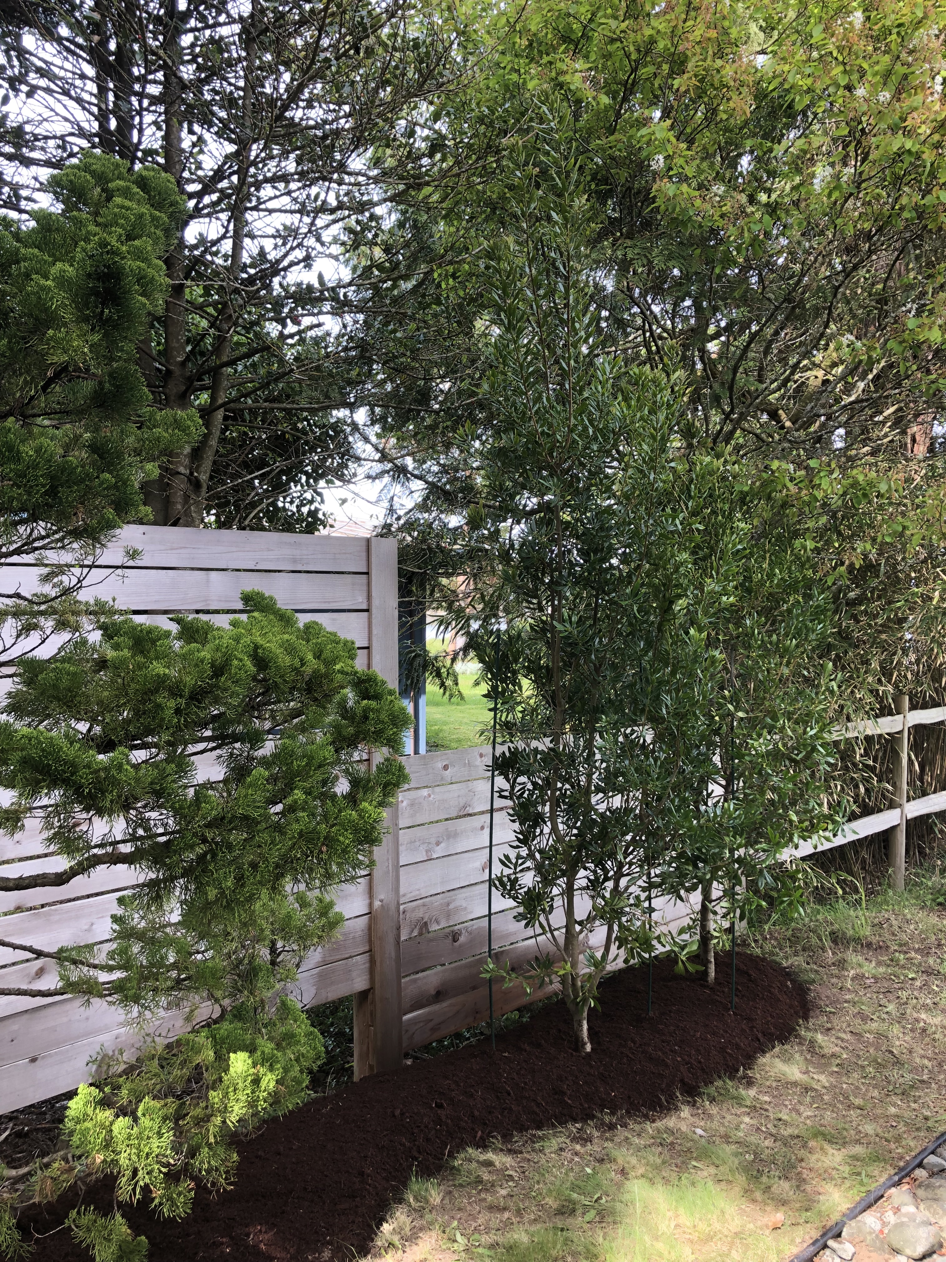 This site is in a windy corridor of salty Salish sea air! Plants here need to be salt and wind tolerant as well as drought and deer resistant! I’ve planted quite a few of these gorgeous evergreen PNW native plant, Myrica californica or Pacific Wax Myrtle with great success. It’s difficult to find as larger specimens now as it’s a highly coveted plant for this climate but I managed, thanks to Kimoff Nursery on the Saanich Peninsula.
